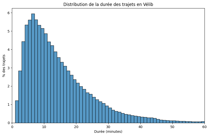 Cela exclut les trajets « boomerang » ainsi que les trajets trop courts ou long pour être représentatifs de l’usage réel de Vélib.