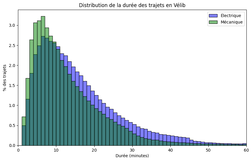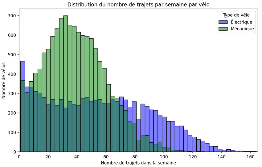 Nos données ayant été collectées après ce changement tarifaire, on observe une sur-utilisation des Vélib électrique (2x plus utilisés que les mécaniques) moindre que celle avancée par l’opérateur Smovengo pour justifier ce changement («[les] modèles électriques, qui représentent 40 % du parc et sont utilisés chacun douze fois par jour en moyenne, trois fois plus que leurs homologues mécaniques»).
