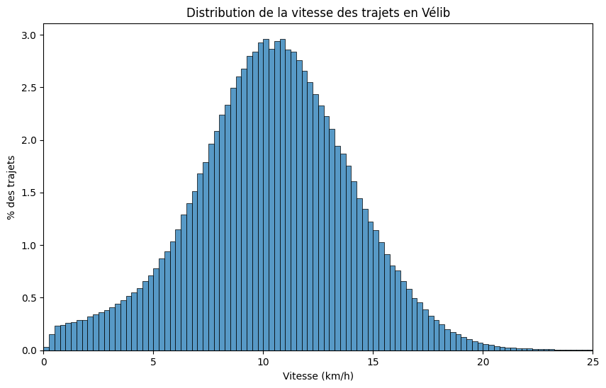 Pour calculer la vitesse des Vélib, nous nous basons sur la distance à vol d’oiseau entre stations, ce qui n’est pas 100% réaliste.